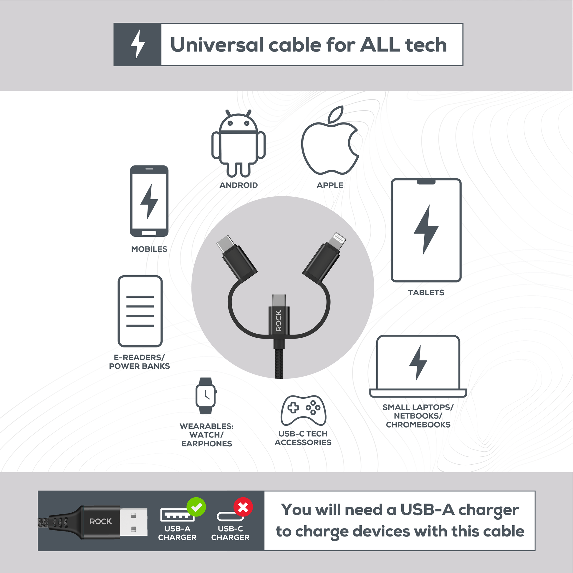 Charge all your devices with one cable. The Rock Go Power 3-in-1 charging cable includes interchangeable connectors, USB-C, Apple Lightning (MFI/Apple approved), and Micro USB, making it compatible with almost any smartphone, tablet, or electronic device. Perfect for iPhone, Samsung, Android, and other powered gadgets, this universal charging cable is the only one you’ll ever need.