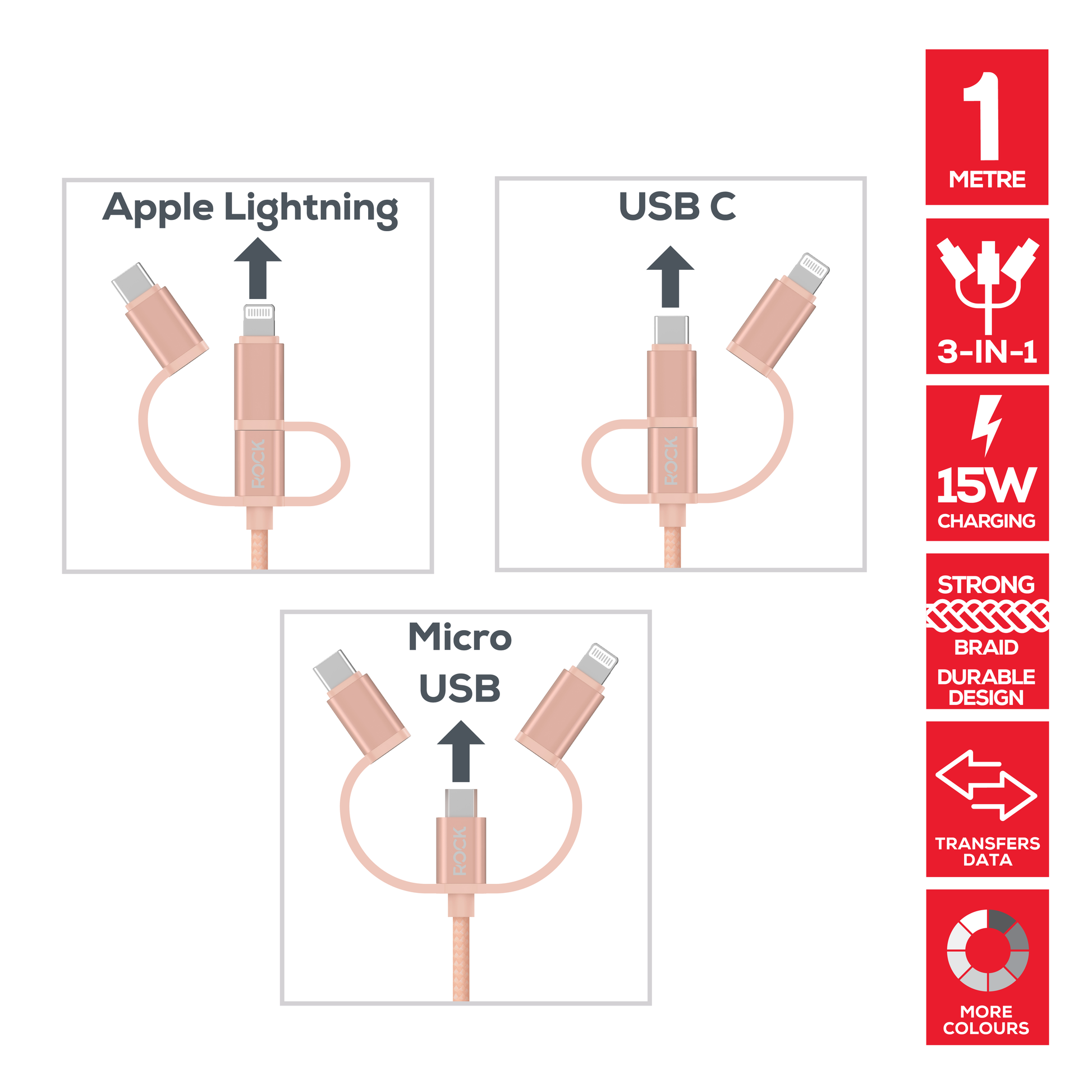 Rock Go Power Braided 1 Metre 3-in-1 Charging Cable - Champagne