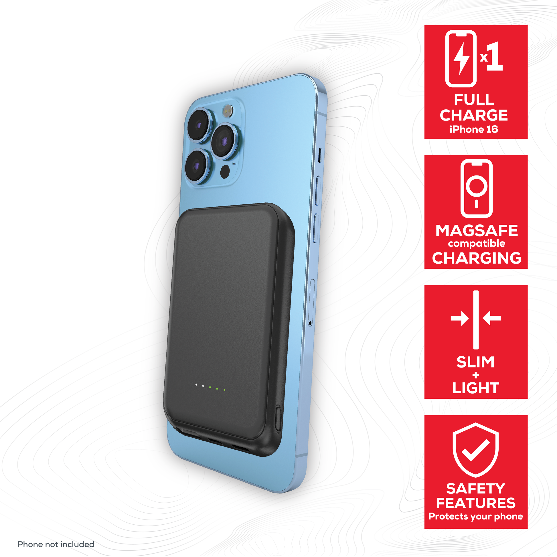 Stay powered up wherever you are with Rock’s Go Power 5000mAh Magsafe power bank. The compact design delivers roughly one full charge for your iPhone* or smartphone in a slim, lightweight body that snaps securely to any MagSafe-compatible device or case.