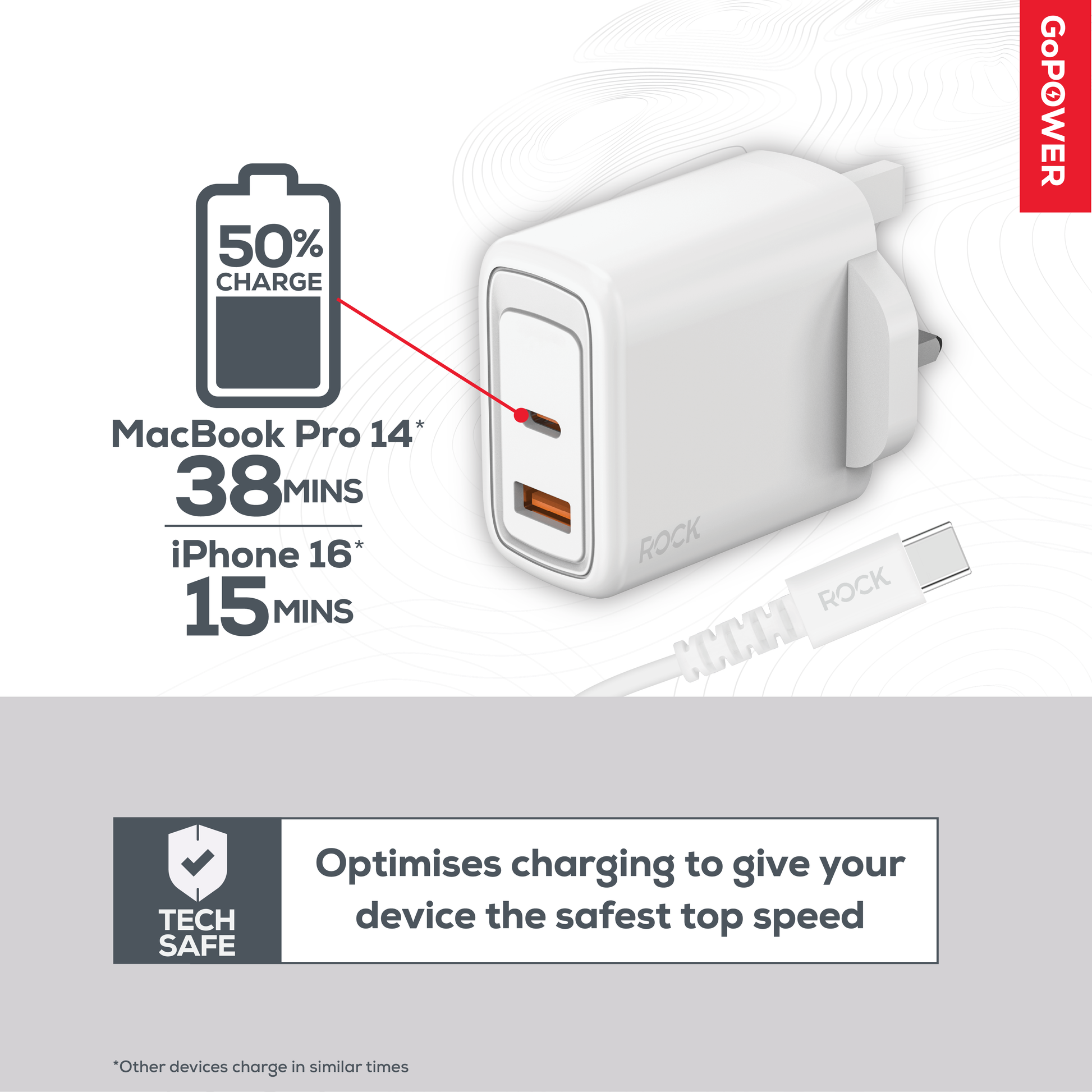 Powered by GaN technology (Gallium Nitride), Rock’s charger delivers fast, efficient energy while staying cool. The USB-C port features PPS (Programmable Power Supply), allowing it to dynamically adjust voltage and current for Samsung Super Fast Charging and other devices that support PPS. This ensures optimised charging speeds, reduced heat, and longer battery lifespan. It supports 65Watt USB-C fast charging, meaning your iPhone can go from 0–50% in about 15 minutes, a Macbook Pro 14” from 0-50% in 38 minutes, and your Samsung Galaxy can get the rapid charge it needs without overheating.