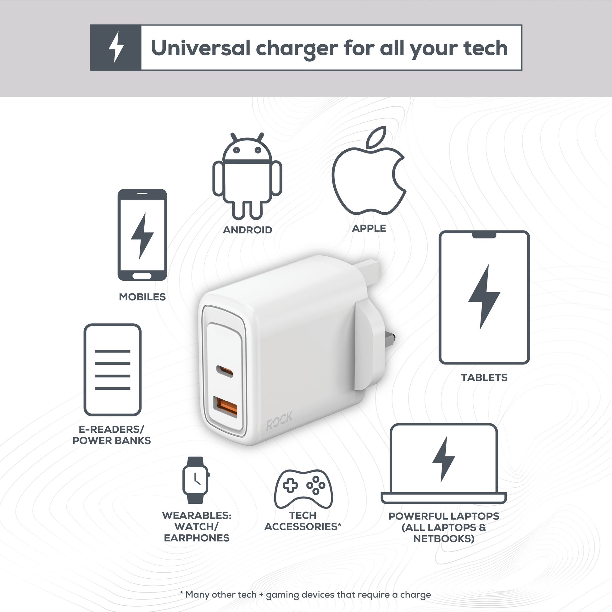 Rock’s Go Power Pro 65Watt GaN Dual Wall Charger is your go-to USB-C fast charger for Apple, Android and all your everyday devices.