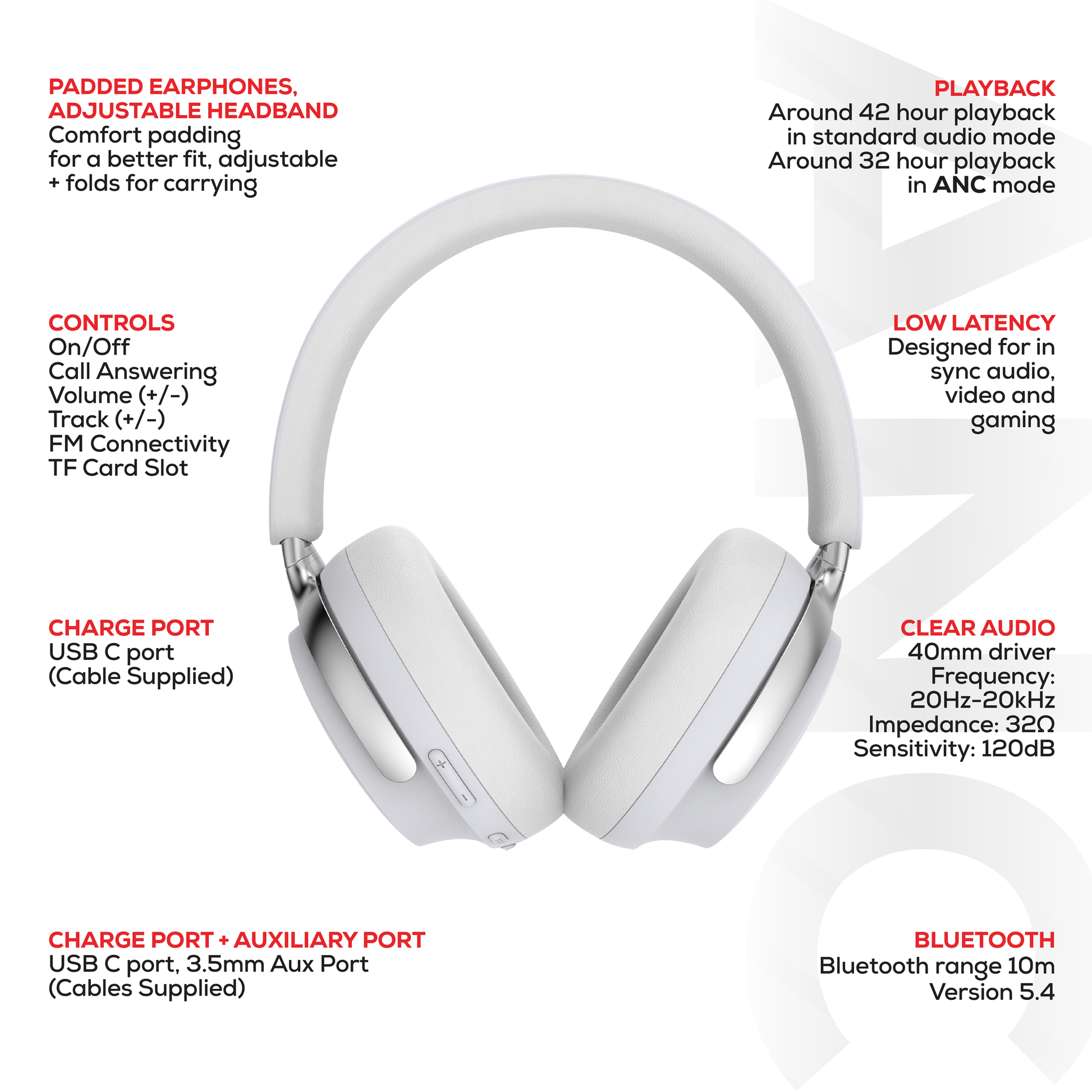 Rock Montari ANC Bluetooth On-Ear Headphones with 42 hour Playback - White